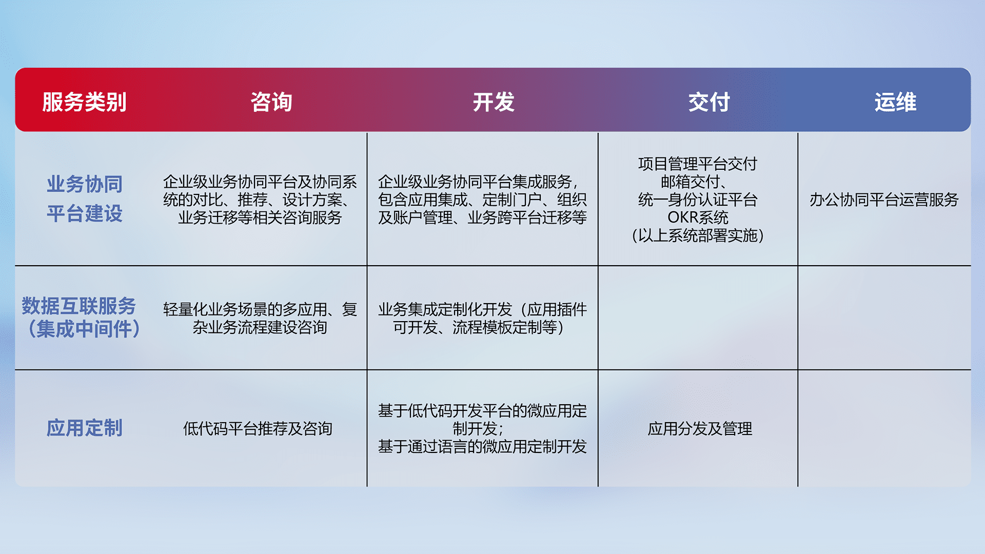 针对钉钉、、企微、、、IDaas等平台级产品提供产品的规划、、、、方案、、交付、、、定制化开发等服务,,实现如统一协同办公、、智能客户服务、、、、混合会议管理、、、智能数据查询、、、、等业务场景,,,实现数字化转型。。。。